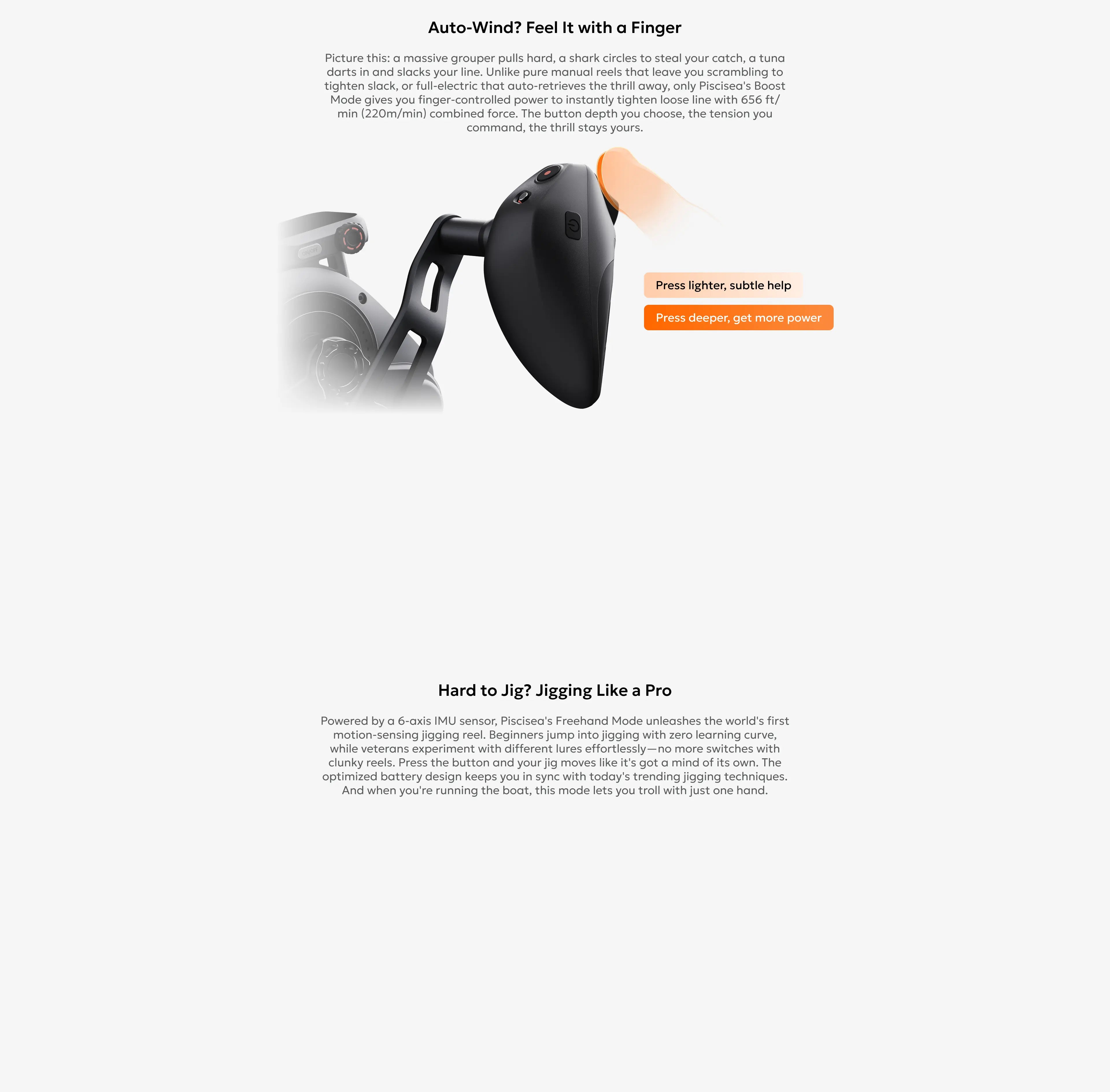 Hybrid means you get the best of both worlds — the raw power of an electric reel and the classic feel of manual control. It eliminates the fatigue of fighting fish with a manual reel, reduces the risk of line slackness, and avoids the lack of engagement found in traditional electric reels that can feel like cheating and kill the fun. With Piscisea, you can fight fish your way — reel by hand, go fully electric, or combine both forces for maximum power to handle whatever bites.