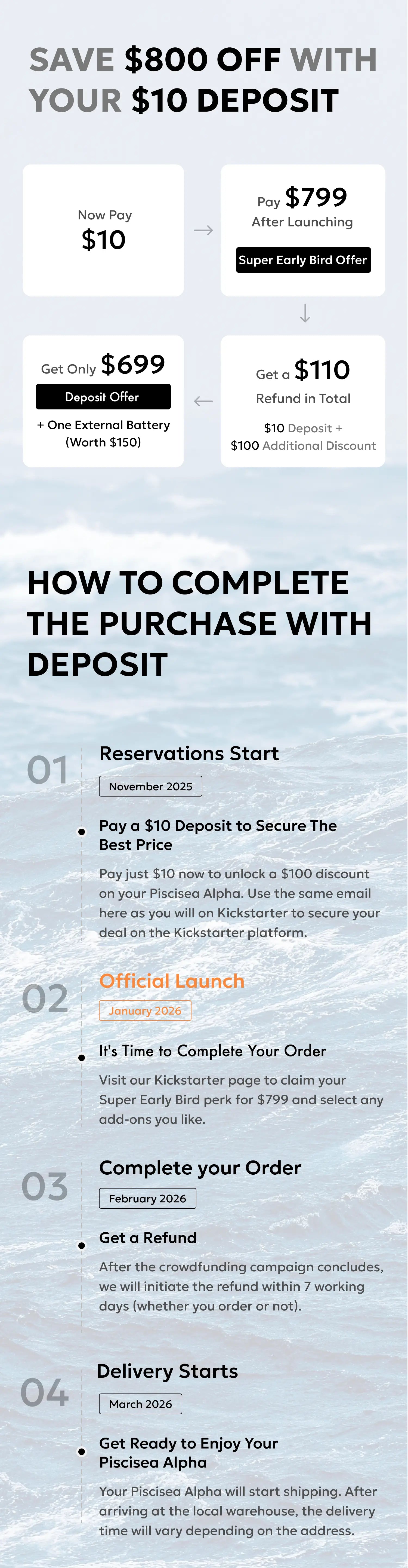 Once you place the deposit, you can secure the exclusive discounted price starting from $699 for the Piscisea Alpha. We guarantee that this will be the best price for Piscisea Alpha throughout the entire lifespan. Furthermore, the deposit is refundable in case you change your mind. Your satisfaction is our top priority.